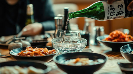 A vibrant table setting with a hand pouring soju into a glass, surrounded by Korean side dishes.