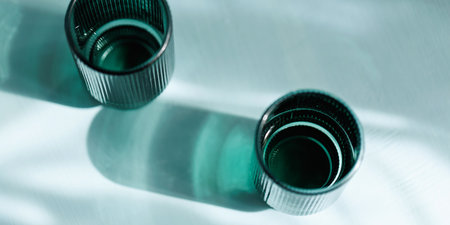 Minimalist beauty photography, a glass and ceramic table with green vases and an empty circular tray on it, featuring a teal blue-green gradient background with the shadows of plants. A tall turquoise cosmetic bottle is placed next to two transparent glass cups filled with water. The entire scene exudes elegance and serenity. --chaos 30 --ar 16:9 --v 6.1 Job ID: cfc6c415-c149-4476-b381-280e53e207e1