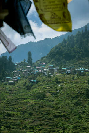Landscape of snow covered mountains of Himalayas in Background, and in foreground, mountains with deciduous forests with beautiful Hamlet or Village in valley on bright sunny day with cloudy blue sky.