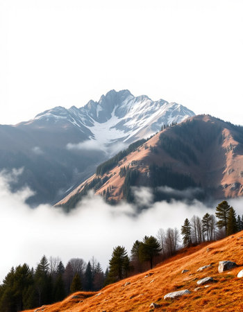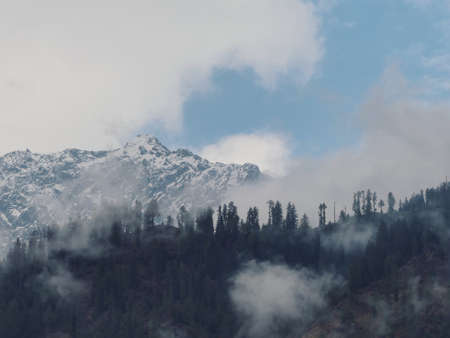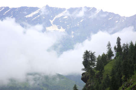 Landscape of mountain range covered with snow in Manali during summers, captured during the sunset with mist and fog