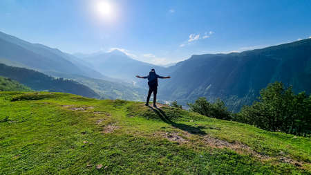 A man with big hiking backpack spreading his arms wide open, while standing on the mountain peak, overlooking Zardlashi - a mountain village in Georgia. Breathing in fresh air. Freedom and serenity