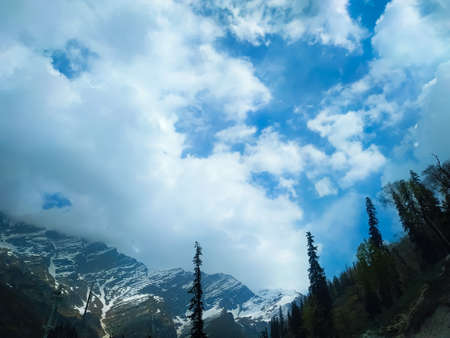 Looking up at these snow covered mountain peaks from Mountain in Manali, Himachal Pradesh, India as the wind blows snow off the top