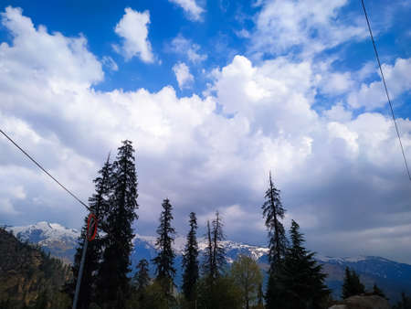 In the front pine woods on background Himalayan mountans and sky with clouds