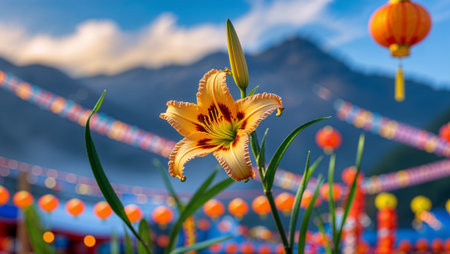Yellow lily with fringed petals blooming in a vibrant mountain festival adorned with colorful lanterns and prayer flags. Ai generated image