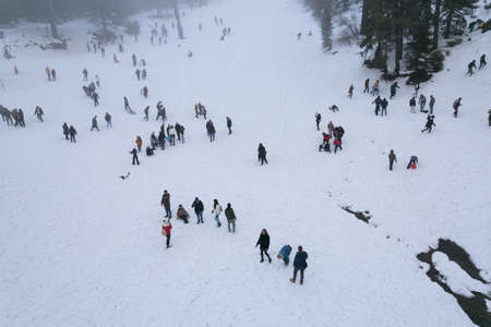 SOLANG VALLEY, MANALI, HIMACHAL PRADESH, India OCTOBER 26 2017: Tourists walking around on ski ground at Paragliding site. In summer famous for adventure sports and winter day it becomes snow covered.