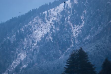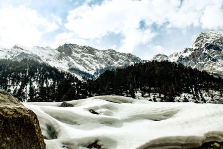 Snow White in kashmir covered hills mountains plants valley. Snow fall in Jammu and Kashmir is common from December to February, snowing attracts tourists and winter games are also played on snow.