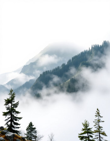 Beautiful mountain landscape with fog and conifer trees in the foreground