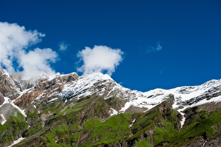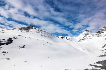 Snowy mountains against the blue sky with white clouds. Mountains of Nepal.