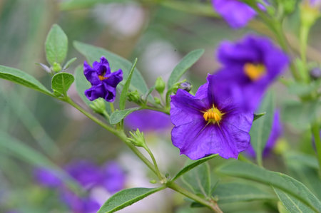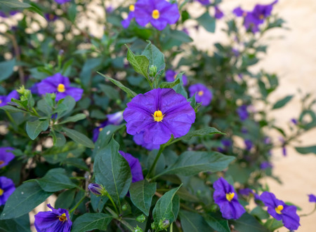 Close up Purple flower of Solanum rantonnetii. the blue potato bush or Paraguay nightshade. Purple flower with yellow center and green leaves