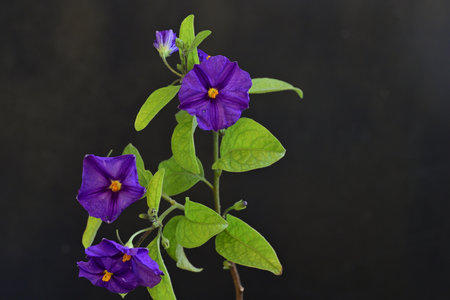 Flowers of a jasmine nightshade, Solanum laxum, with a black background.