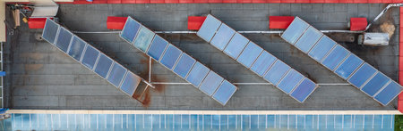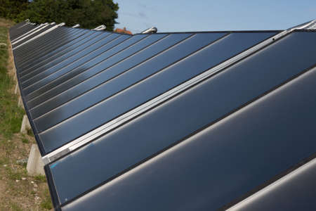Building roof with rows of blue photovoltaic panels and vacuum air solar collectors for water heating and producing clean ecological electricity. Renewable electric and heat energy with zero emission