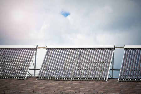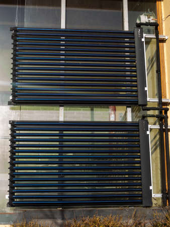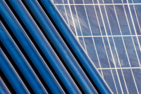 solar heating tubes used for heating water are situated with a solar panel as background.