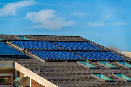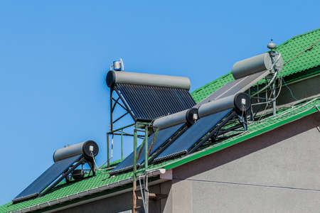 Thermal solar panels water heaters alternative technology of water heating on the roof tile of the house against the blue sky background.