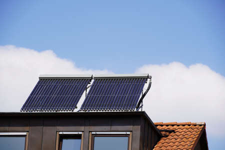 Solar thermal system on the dormer. The panels are slanted to absorb even more solar energy. The blue sky with some fair weather clouds promises a high yieldy with some fair weather clouds promises a