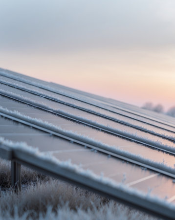 AI Generated. Solar panels covered in a thin layer of morning frost reflecting the soft glow of the rising sun