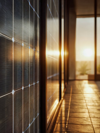 Sunlight shines over solar panels on a house front, casting golden glows that dance across a tiled room interior, creating a cozy, eco-friendly ambiance.