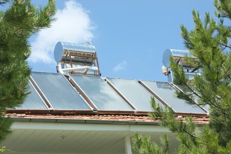 Solar water heaters are installed on the tile roof of the hotel for eco heating of water. Banner view