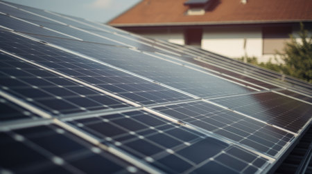 Close up view of solar panels on house rooftop. Generative AI AIG19.