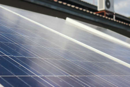Solar panels grid on roof generating electricity close up. Sustainable green energy.