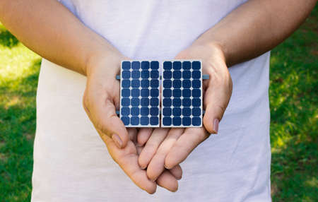 Holding solar energy photovoltaic panel at a green natural background - Concept Image of Sustainable Resources
