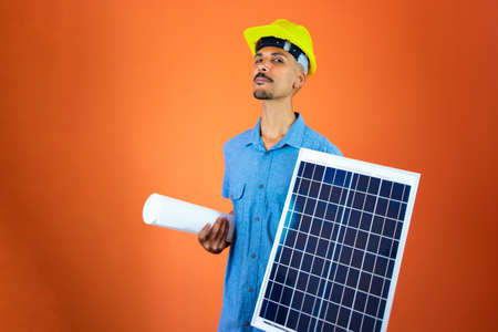 Worker With Helmet and Individual Protection Equipment Holding a Solar Photovoltaic Panel isolated. Solar Worker isolated in orange background.