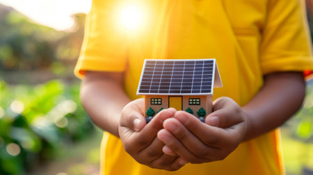 a hand holding a small model house with prominent solar panels installed on its roof, highlighting the role of renewable energy in eco-friendly living