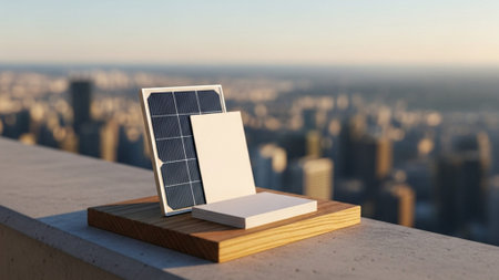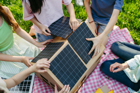 Two hands are delicately holding a solar panel, emphasizing renewable energy technology. The focus on the panel suggests a moment of appreciation for solar powers potential in sustainable living.