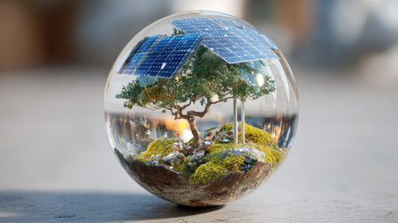 A glass globe encases a miniature tree, moss, and solar panels, symbolizing environmental protection and sustainable energy. The image showcases realistic textures and soft lighting. This conceptual artwork could be used in editorial content or commercial projects related to ecology, renewable resources, or future innovations.