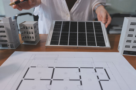 On desk of engineers lay model of house And solar panels to use in planning installation of solar panels to house in order to get most cost effective energy from installing solar panels.