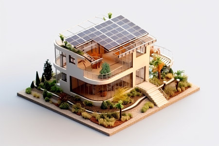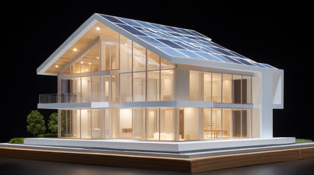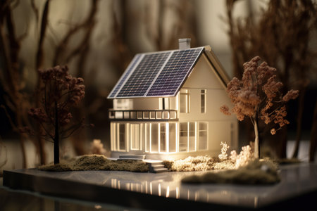 Architectural model of a house with solar cells, emphasizing solar-powered housing design