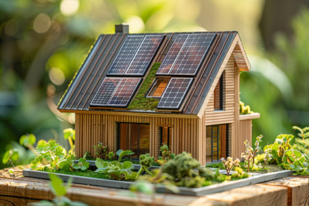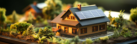 Eco friendly model house with solar panels and plants on sunny day, symbolizing sustainability