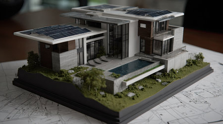 This image features a detailed architectural model of a contemporary house. The model showcases a modern design with solar panels and a swimming pool. The composition has a neutral color palette with hints of green, suggesting an outdoor setting. This image is suitable for various commercial uses, including design, construction, and architectural concepts.