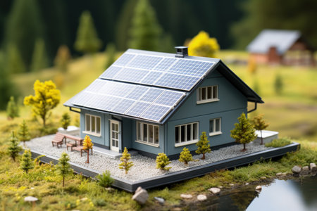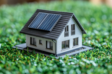 Eco-friendly house model with solar panel in lush green field, sustainable living concept