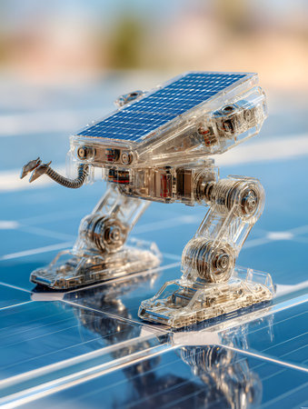 A transparent solar cleaning robot with articulated legs and claw walking on photovoltaic panel, efficient maintenance and eco friendly technology