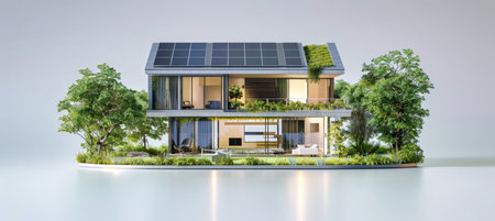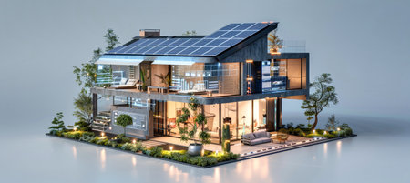 A 3D rendering of a modern smart home with solar panels on the roof and digital data displayed on the windows, creating a futuristic and sustainable feel.