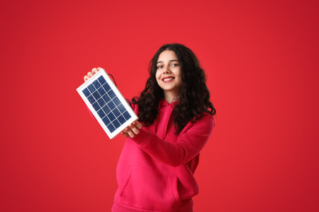 A vibrant arrangement of a solar panel and assorted hand tools against a striking red background. This image captures the essence of DIY, maintenance, and eco-conscious technology. Perfect for energy and repair themes.