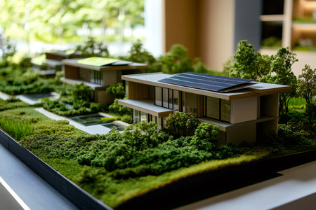 Architectural model showcasing modern homes with solar panels and lush green landscapes, emphasizing sustainable living and design