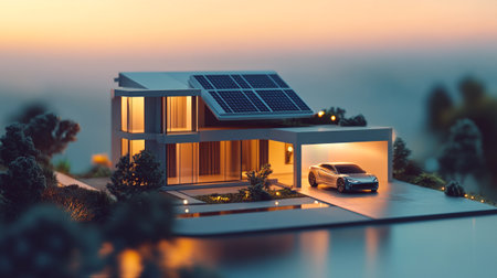 Modern smart home 3d model with solar panels, renewable energy concept on blurred background