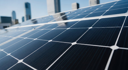 Solar panels on a city rooftop with a blurred urban skyline in the background. Represents renewable energy, sustainable power generation, and green technology in an urban environment.