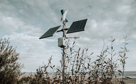 Pair of solar panels on a pole. Ecological energy. Cloudy sky.