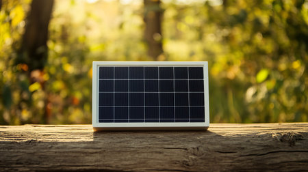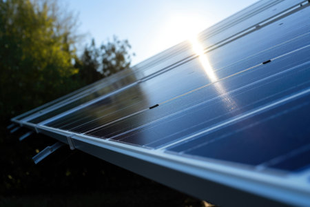 A close-up view presents a solar panel reflecting sunlight against a backdrop of blurred trees and a blue sky. The image features a shallow depth of field, with soft focus on the background. This composition showcases sustainable energy concepts. Suitable for environmental or technological related projects.