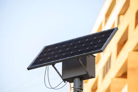 Solar panels installed in the city. Alternative energy source. Panoramic view.