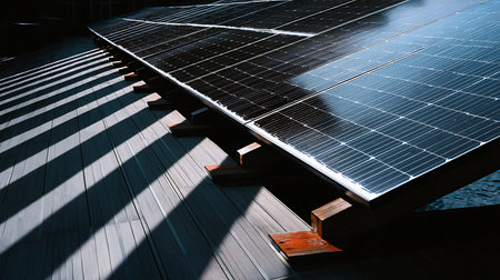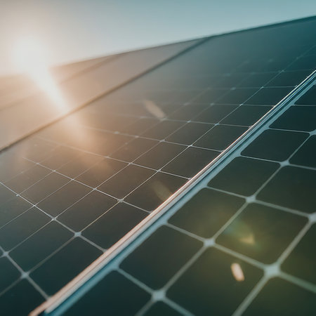 A close-up of solar panel surfaces reflecting sunlight efficiently.