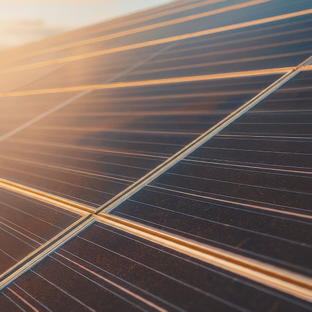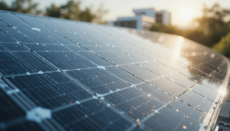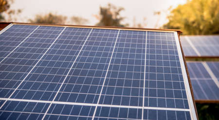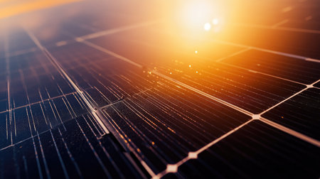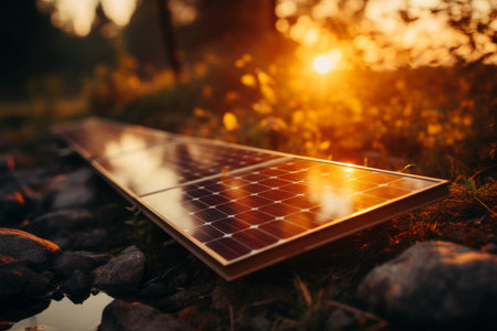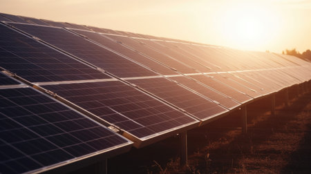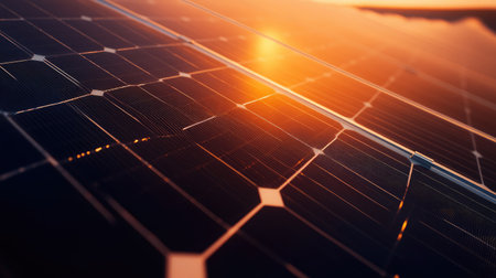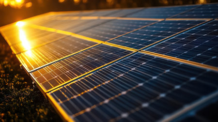 Close-up view of solar panels generating renewable energy at perfect sunset for sustainable living