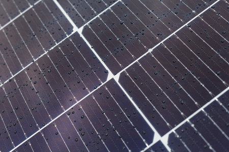 Photovoltaic solar energy panels in the rain. Water raindrops on cell glass.