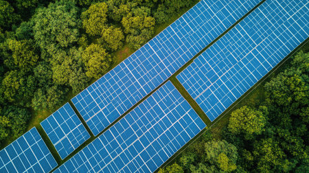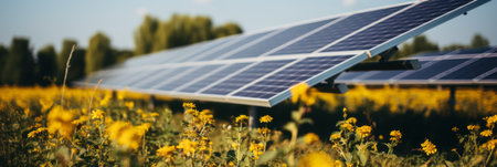 Amidst a lush meadow and forest, solar panels stand tall, harnessing the suns energy. Their gleaming surfaces reflect the vibrant sky, creating a mesmerizing sight.