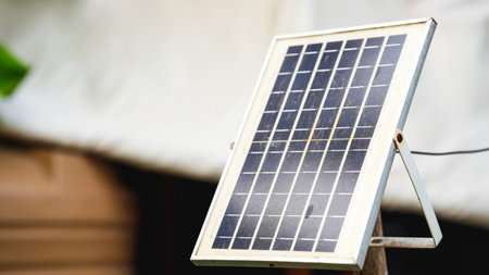 Close up solar photovoltaic panels, charging batteries. Renewable eco energy concept
