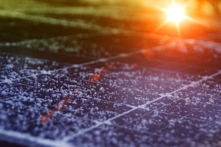 Snowflakes on solar panels. Electricity production from the sun and photovoltaic in winter season.