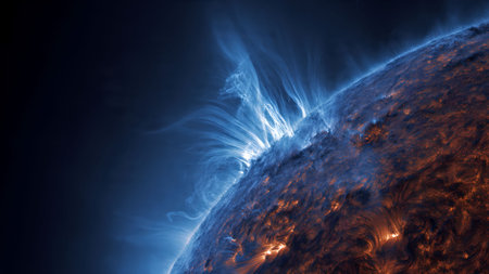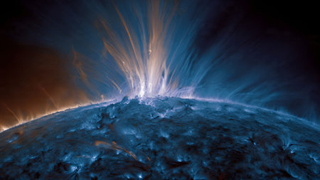 Dramatic view of a solar flare erupting from the sun's surface, showcasing plasma loops and magnetic activity.