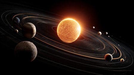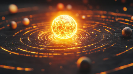 A stunning cosmic scene featuring a luminous sun at the center, surrounded by orbiting planets. This illustration captures the beauty of space and celestial mechanics.